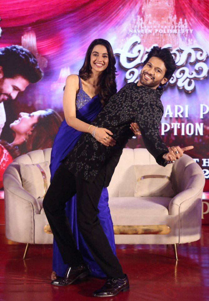 నాయకానాయికలు నవీన్ పొలిశెట్టి, మీనాక్షి చౌదరి ‘అనగనగా ఒక రాజు’ చిత్రంలోని ‘భీమవరం బాల్మా’, ‘రాజు గారి పెళ్లిరో’ పాటలకు వేదికపై నృత్యం చేసి అందరిలో ఉత్సాహం నింపారు. అనంతరం అతిథులందరికీ స్వాగతం పలికి, నిజంగానే పెళ్లి రిసెప్షన్ వేడుకను తలపించారు. ఇక నవీన్ పొలిశెట్టి, మీనాక్షి చౌదరి నూతన వధూవరులులా వేదికపై కనిపించడం ప్రత్యేక ఆకర్షణగా నిలిచింది. పాత్రికేయలు బంధుమిత్రుల్లా ఒక్కొక్కరిగా వేదికపైకి వచ్చి.. ఆ జంటను ఆశీర్వదించడం, గిఫ్ట్ కవర్ ఇచ్చి వారిని ఓ ప్రశ్న అడగటం.. ఇలా ఎంతో కొత్తగా, సరదాగా ఈ వేడుక నడిచింది.