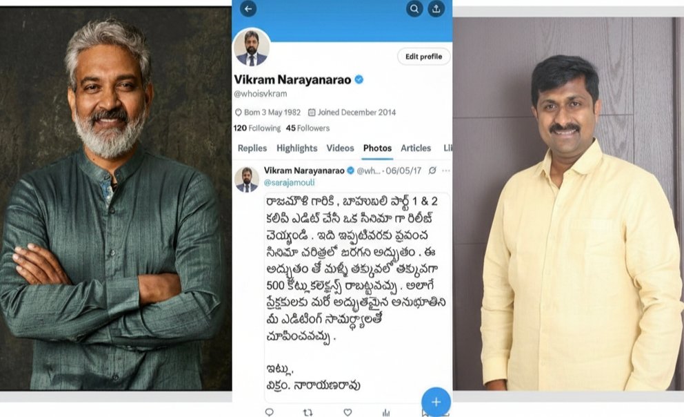 అయితే ఈ ఆలోచనల ఏడేళ్ల క్రితమే లాయిడ్ గ్రూప్స్ అధినేత, ధనిక భారత్ విజన్ సృష్టి కర్త విక్రం నారాయణ రావు గారు సూచించారు. 2017 మే 6న ఆయన ట్విట్టర్లో రాజమౌళిని ట్యాగ్ చేస్తూ – “బాహుబలి పార్ట్ 1, పార్ట్ 2 కలిపి ఒకే సినిమాలా రిలీజ్ చేయండి. ఇది ఇప్పటి వరకు సినిమా చరిత్రలో జరగని అద్భుతం అవుతుంది. కనీసం 500 కోట్ల రూపాయల వసూళ్లు సాధించే అవకాశం ఉంది. అలాగే ప్రేక్షకులకు మరో మాయాజాలమైన అనుభవం ఇవ్వవచ్చు” అని సూచించారు. ‘బాహుబలి 2’ విడుదలైన వారం రోజులకే విక్రం నారాయణ రావు గారు ఈ పోస్టు చేశారు. పదేళ్ల తర్వాత ఆ ఆలోచనను రాజమౌళి నిజం చేస్తుండటంతో, విక్రం నారాయణ రావు గారు ఏడేళ్ల క్రితమే చేసిన ఈ ఆలోచనపై పలువురు అభినందిస్తున్నారు. అటు వ్యాపార రంగంలోనే కాదు ఇటు సినిమా రంగంలోనూ విజన్ ఉన్న లీడర్గా విక్రం నారాయణ రావు గారిపై అన్ని వర్గాల నుంచి ప్రశంసల వర్షం కురుస్తోంది.